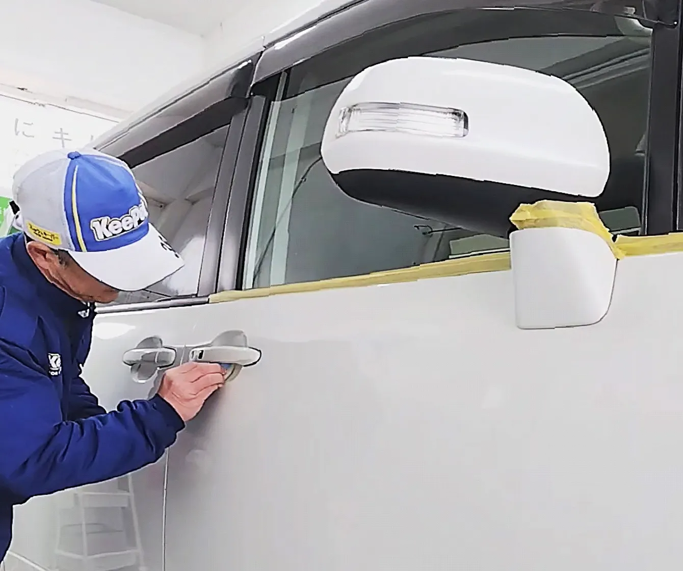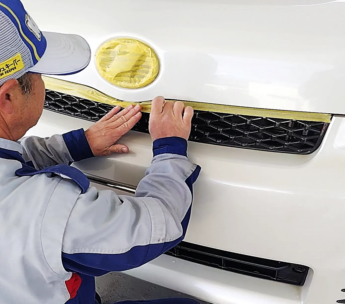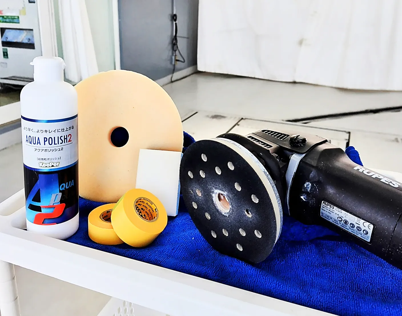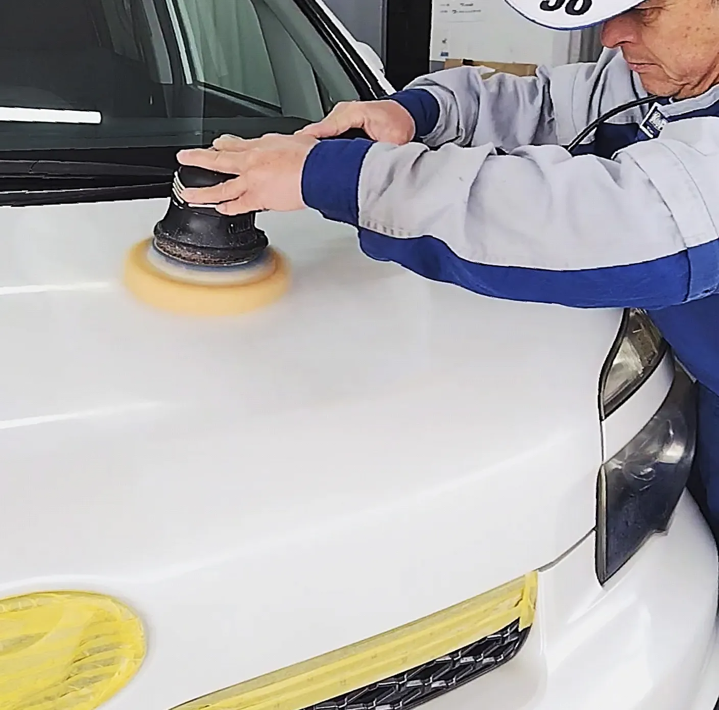 ポリッシャーのコンパウンドをつけたスポンジがあたらないよう 手際よくはっていきます