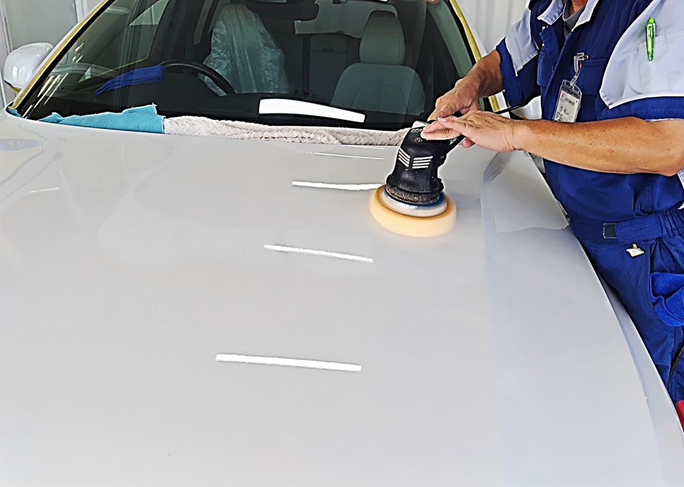 コーティング前の下処理として ポリッシャーでバフ掛け細密研磨を行います コンパウンドをつけて パネルごとにです 100%水ジミが除去できるわけではありませんが かなり薄く目立たなくなって キレイになる様子がよくわかります 細かいところは小さめのスポンジでゴシゴシと磨くんです