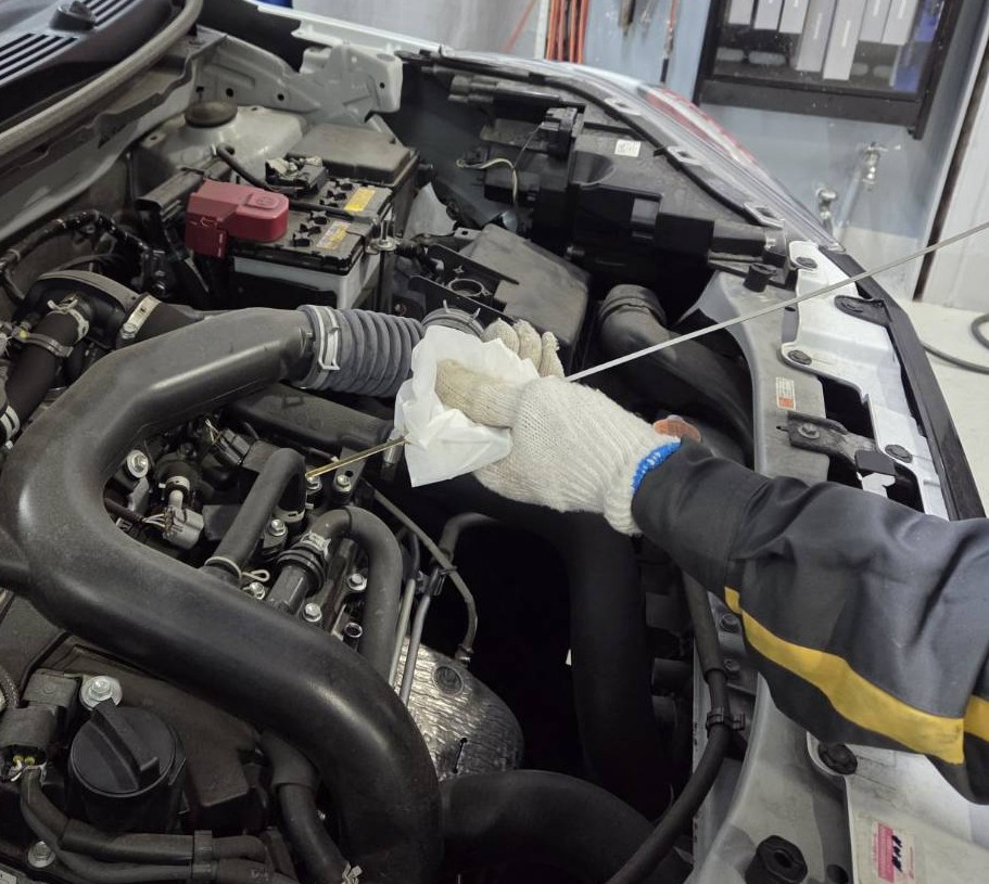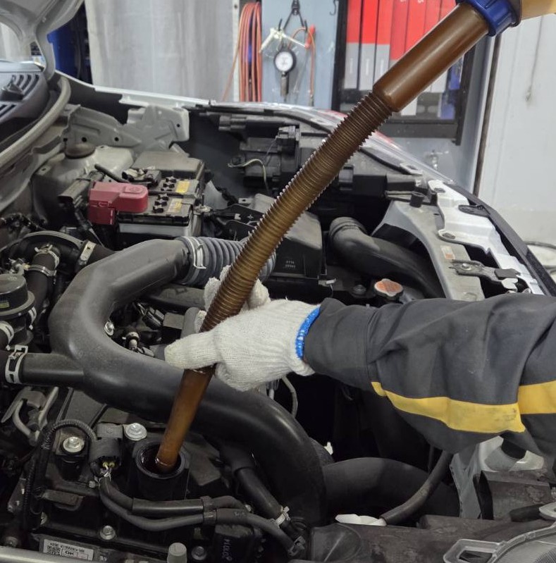 エンジンオイル交換についてのお話です。エンジンオイル交換は昔は下抜きでしたが、近年は上抜き出来る車両は上抜き作業をおこないます。上抜きの方が作業リスクが少ないことと、時間短縮にもつながるためです。