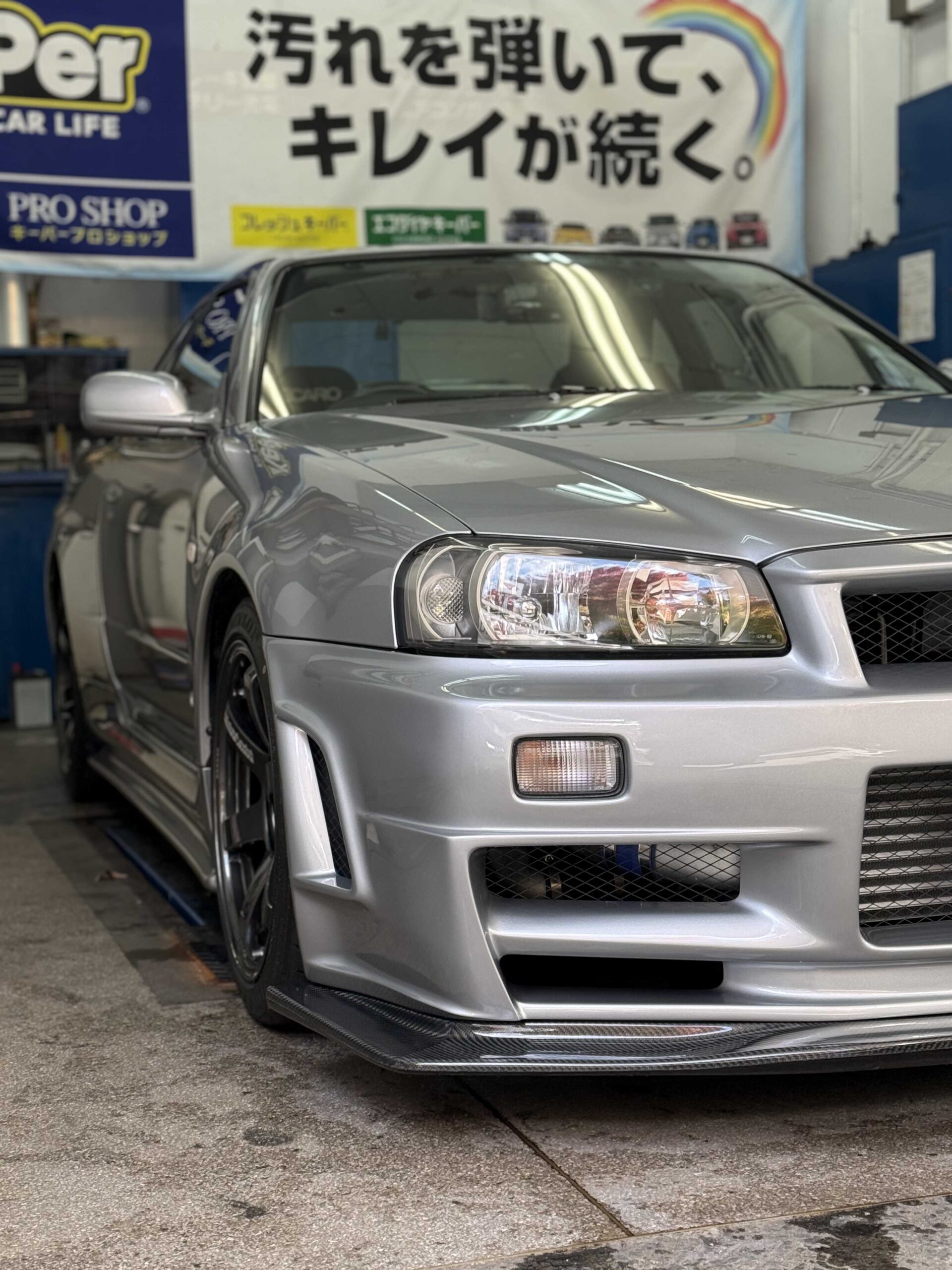 本日は車好きならほとんどの方が知っているであろうお車、名車R34型、スカイラインGT-Rのコーティング施工していきます。