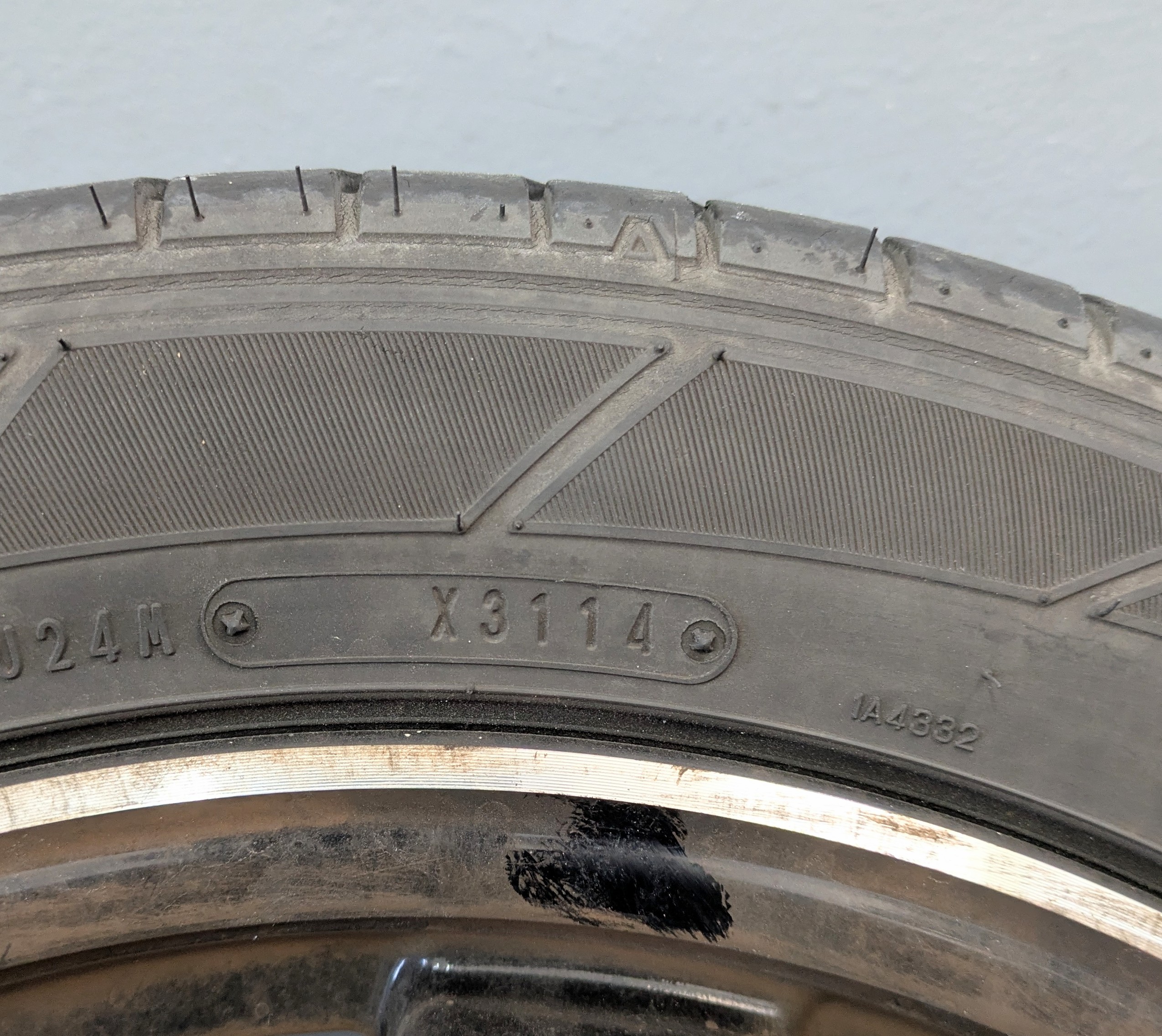ご覧のとおりひび割れが酷いですし、2014年の7月頃に製造されたタイヤで約12年前のものです。